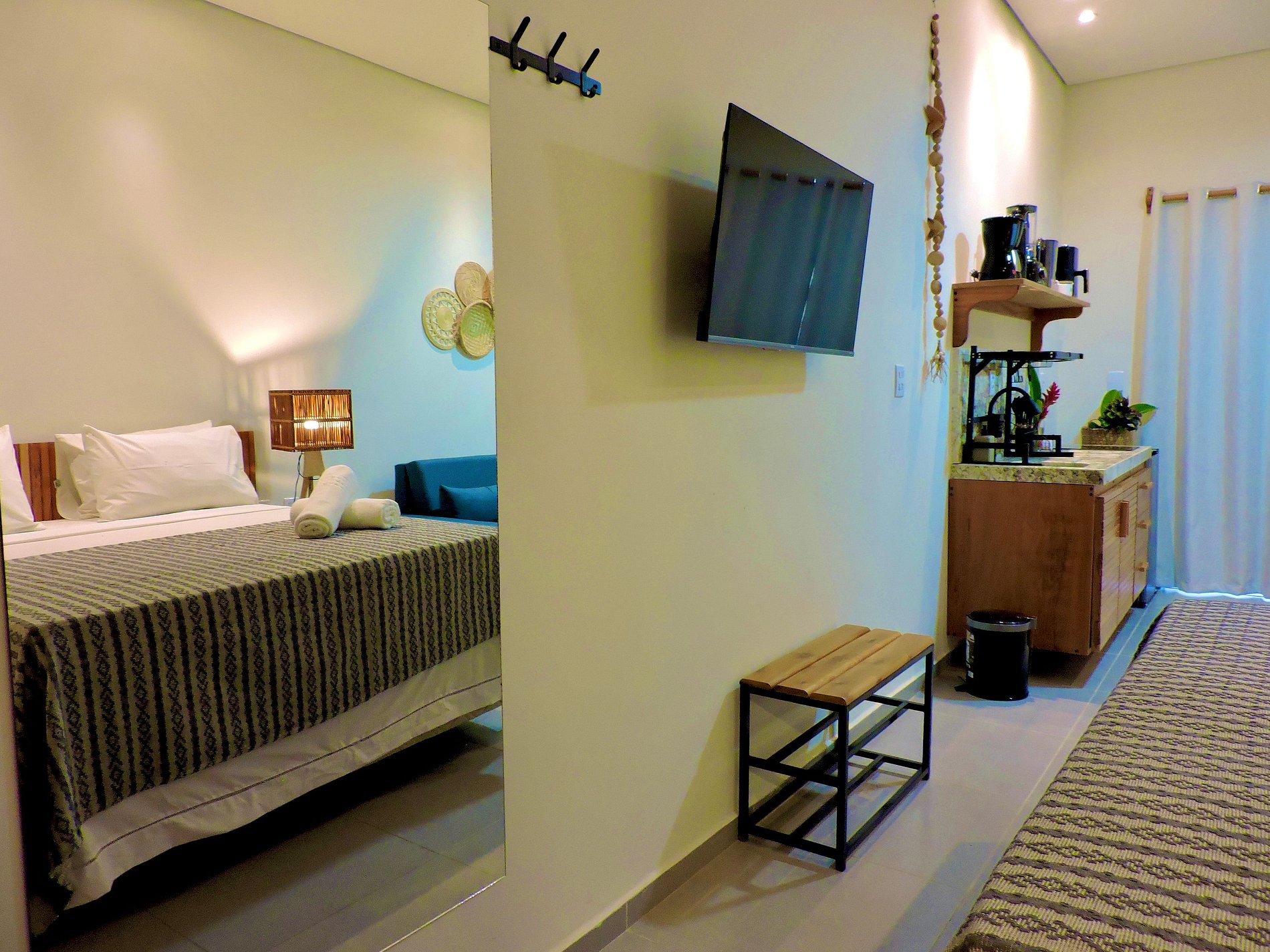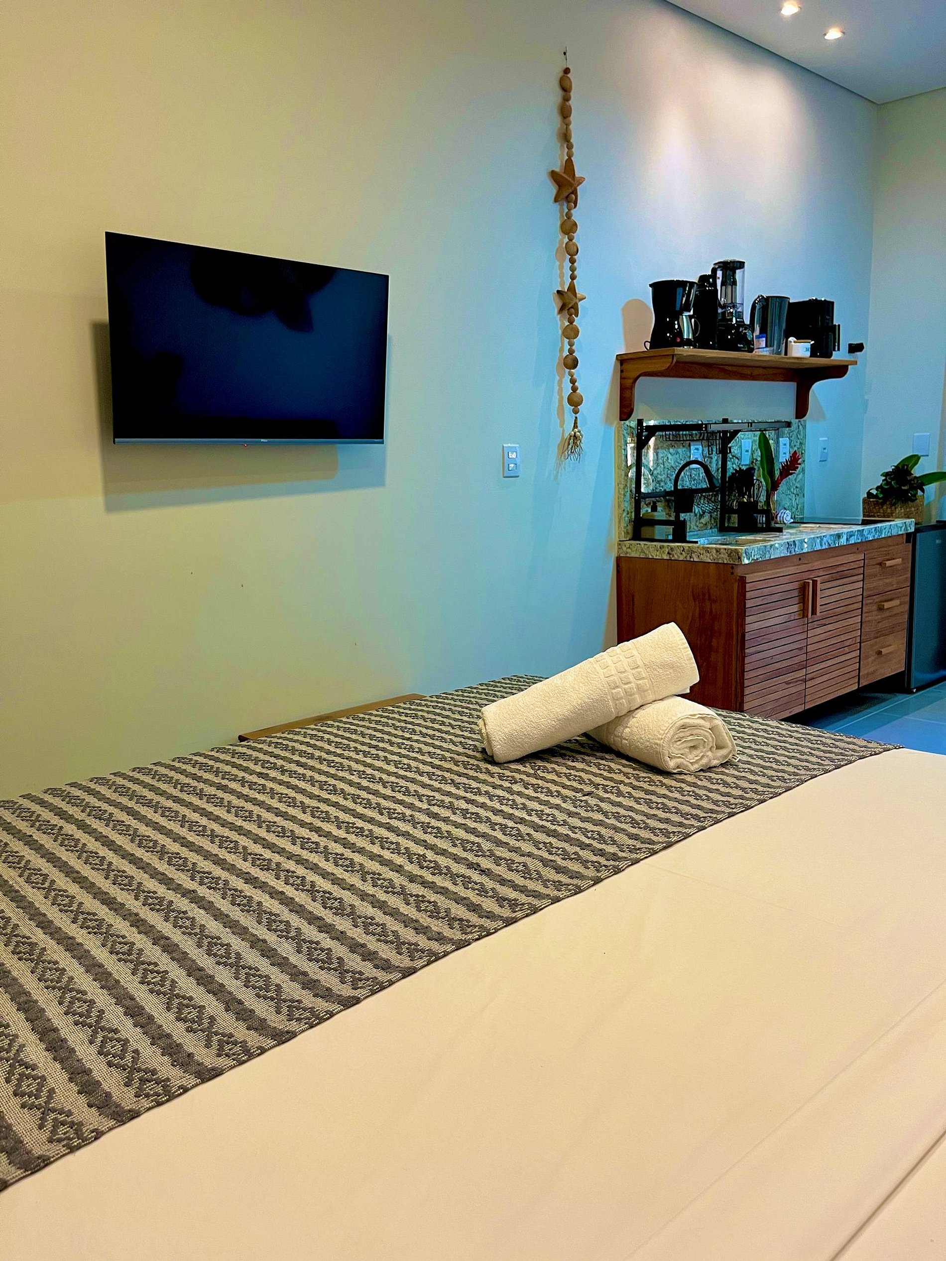 A hospedagem superou as expectativas. O quarto possui um ótimo tamanho, bem distribuído e confortável. A cozinha é bem equipada e atendeu perfeitamente às necessidades durante a estadia. A varanda é excelente, proporcionando um espaço agradável, assim como o banheiro, que conta com bom espaço e água quente funcionando adequadamente. O atendimento digital foi eficiente e prático: tanto as fechaduras quanto o portão digital funcionaram perfeitamente, garantindo muita comodidade no check-in e no check-out. Quando solicitamos o serviço de limpeza, fomos prontamente atendidos, o que demonstrou atenção e agilidade por parte da equipe. A localização é outro ponto extremamente positivo. Foi possível realizar praticamente tudo a pé, com mercado muito próximo e fácil acesso à Rua Pituba, bastante movimentada, com diversas opções de restaurantes e eventos. O terraço é amplo, confortável e se destaca como um excelente diferencial do espaço. No geral, a experiência foi muito satisfatória.